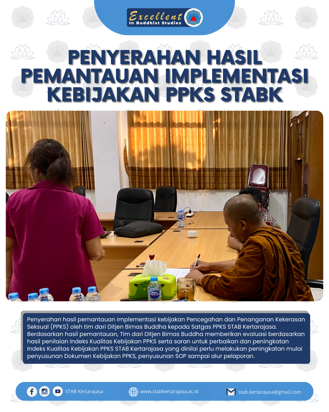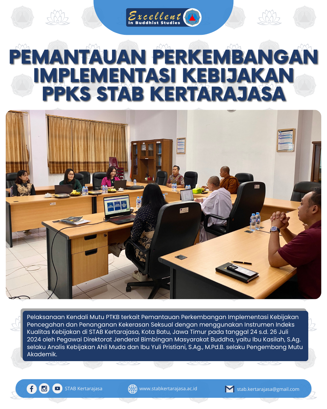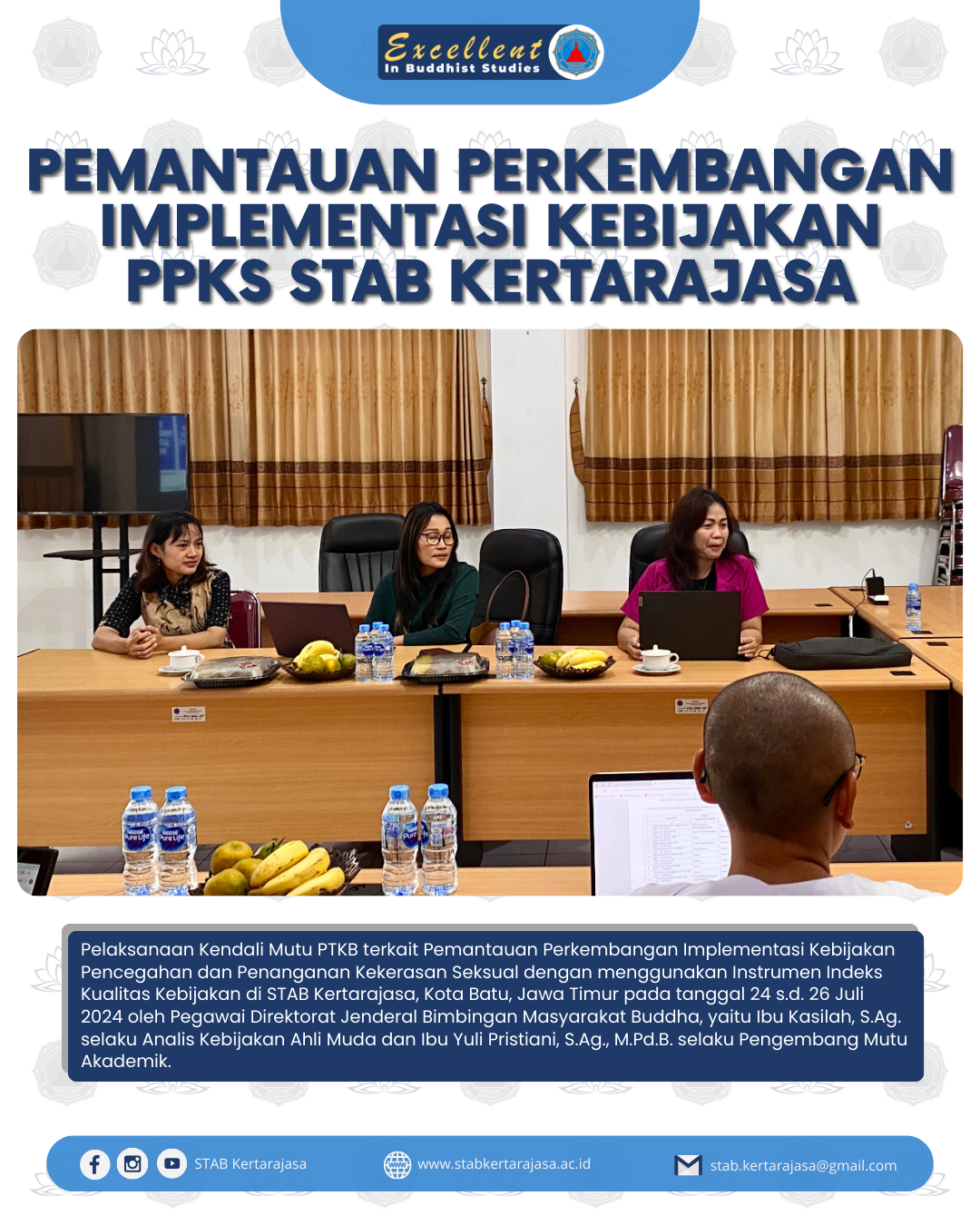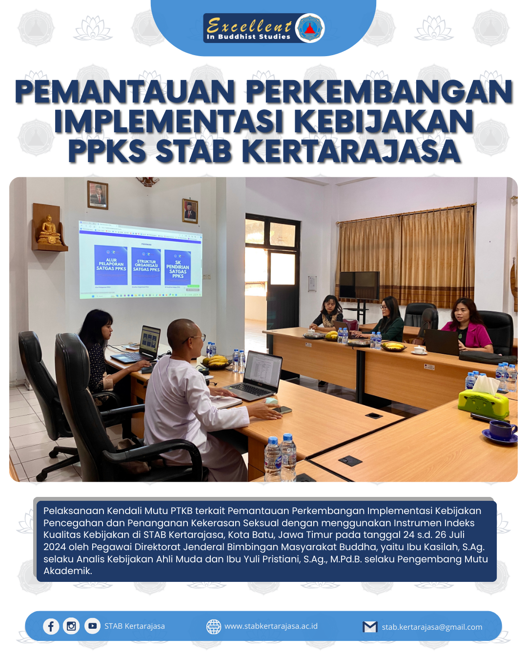 Pelaksanaan Kendali Mutu PTKB terkait Pemantauan Perkembangan Implementasi Kebijakan Pencegahan dan Penanganan Kekerasan Seksual dengan menggunakan Instrumen Indeks Kualitas Kebijakan di STAB Kertarajasa, Kota Batu, Jawa Timur pada tanggal 24 s.d. 26 Juli 2024 oleh Pegawai Direktorat Jenderal Bimbingan Masyarakat Buddha, yaitu Ibu Kasilah, S.Ag. selaku Analis Kebijakan Ahli Muda dan Ibu Yuli Pristiani, S.Ag., M.Pd.B. selaku Pengembang Mutu Akademik.