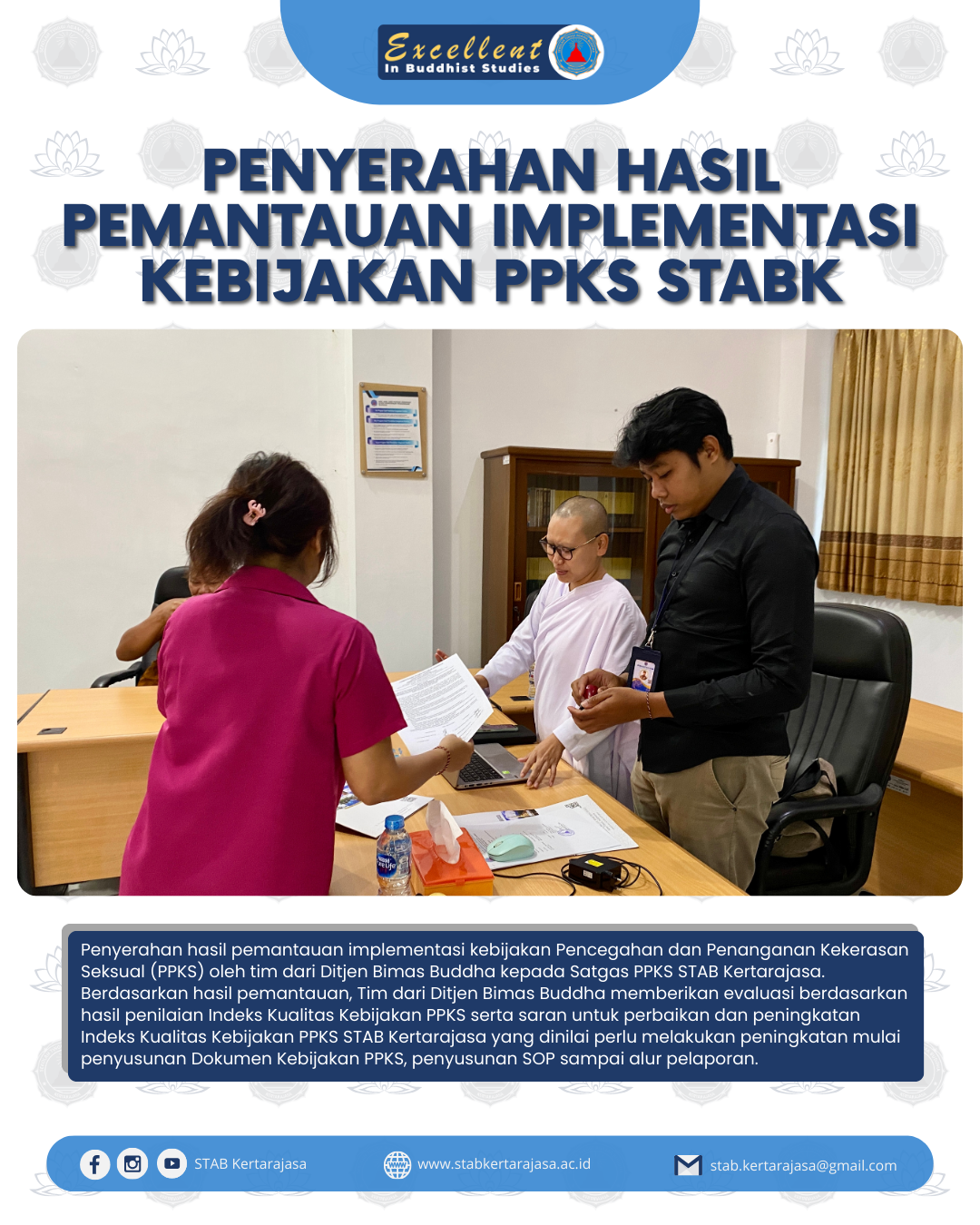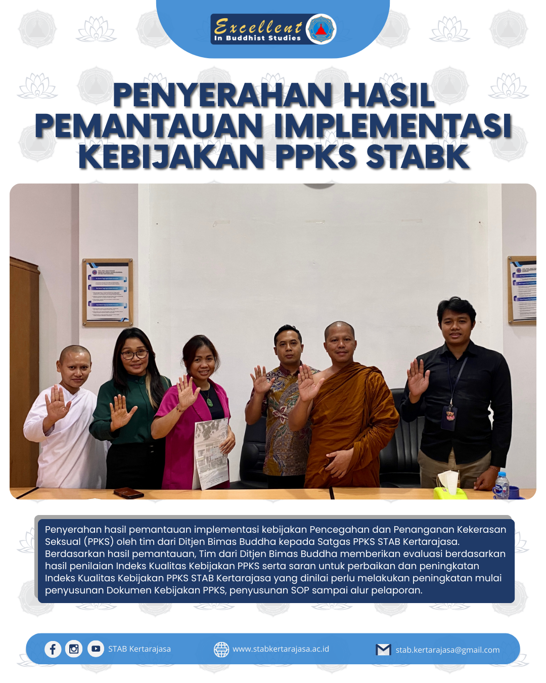 Penyerahan hasil pemantauan implementasi kebijakan Pencegahan dan Penanganan Kekerasan Seksual (PPKS) oleh tim dari Ditjen Bimas Buddha kepada Satgas PPKS STAB Kertarajasa.