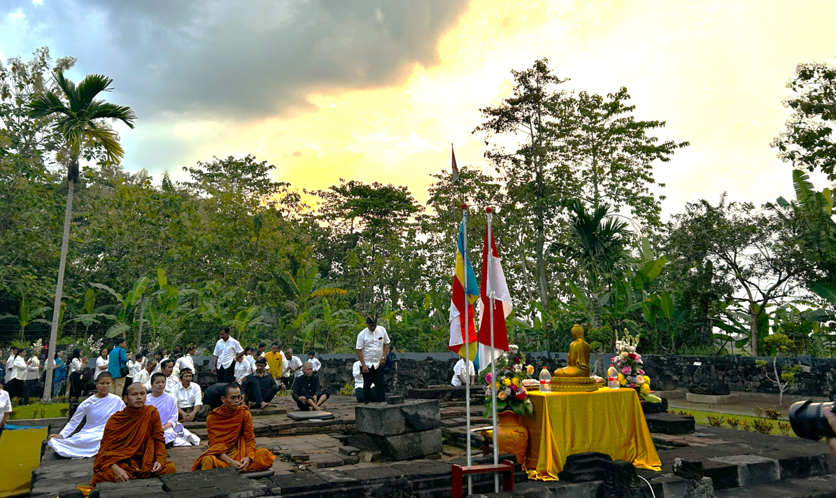 Usai meditasi, suasana beralih ke Anusāsanā, ketika Sāmaṇera menyampaikan wejangan Dhamma dengan nada tenang dan terarah. Ia mengingatkan bahwa Thūpapujā di Candi Simping bukan sekadar ritual, melainkan bentuk penghormatan kepada Sri Maharaja Kertarajasa Jayawardhana sebagai pendiri bangsa, sekaligus penanda harmoni ajaran Siwa-Buddha yang pernah hidup berdampingan. Nilai-nilai kebajikan yang diwariskan—kebijaksanaan, keadilan, dan tanggung jawab moral—dihadirkan kembali sebagai cermin bagi para pemimpin masa kini. Dalam penjelasannya juga disinggung bahwa kemakmuran tidak terlepas dari kebiasaan merawat batin melalui kunjungan ke tempat suci, serta praktik persembahan yang dimaknai sebagai bentuk dana dan penghormatan yang bijaksana. Rangkaian kemudian ditutup dengan Paritta Patidāna, pelimpahan jasa kebajikan kepada para leluhur, yang dilantunkan dengan khidmat sebagai ungkapan bakti dan ingatan yang tulus.