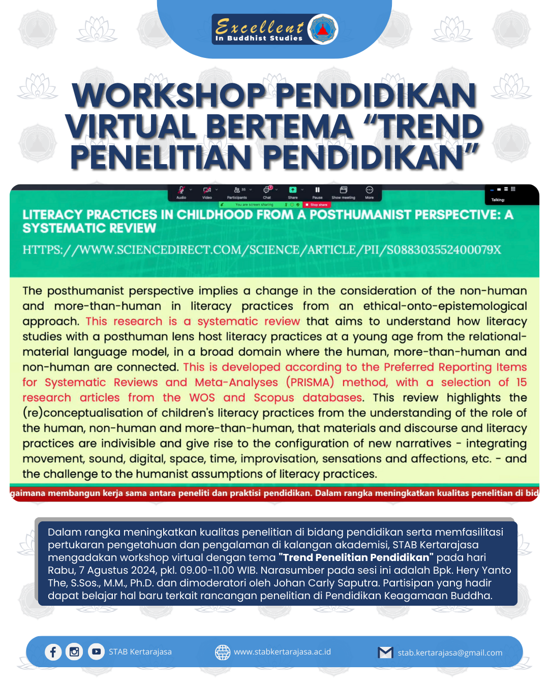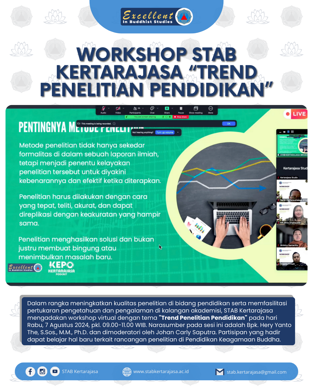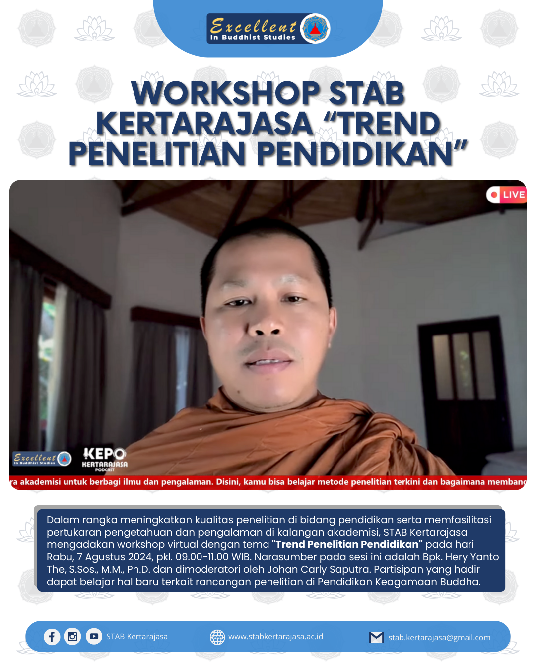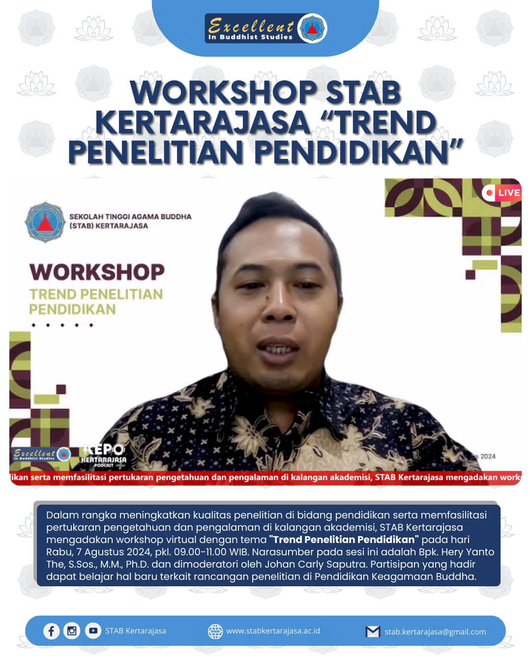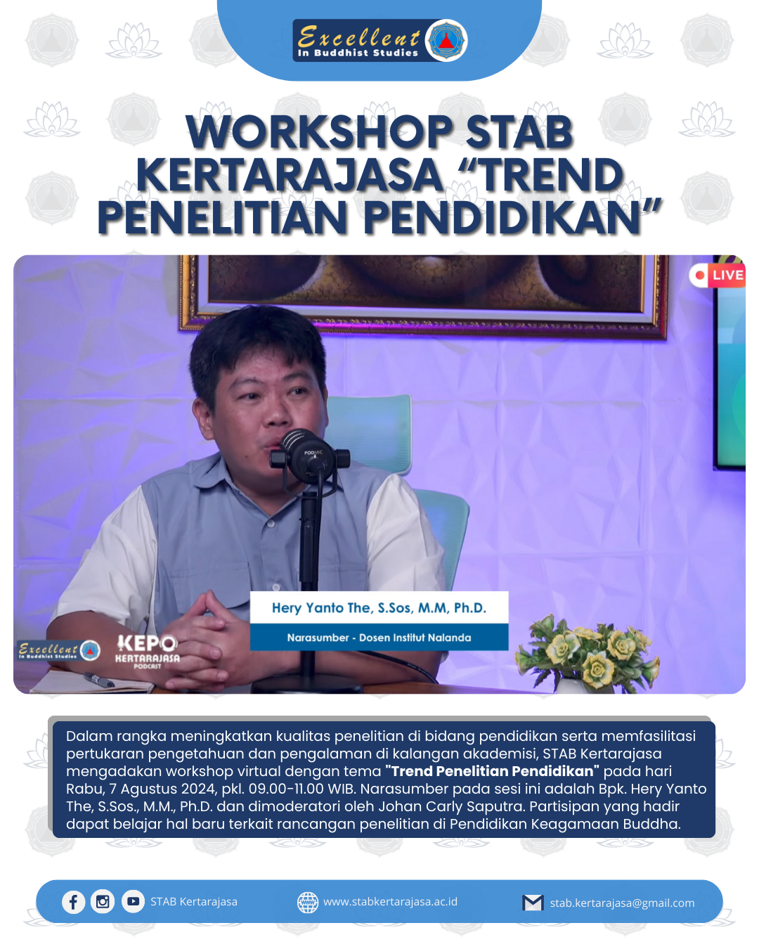 Pada tanggal 7 Agustus 2024, STAB Kertarajasa sukses menyelenggarakan Workshop Trend Penelitian Pendidikan secara daring, yang menghadirkan Hery Yanto The, S.Sos, M.M, Ph.D., dosen Institut Nalanda, sebagai narasumber utama. Hery, yang berlatar belakang pendidikan yang beragam, menekankan pentingnya pendekatan multidisiplin dalam penelitian.